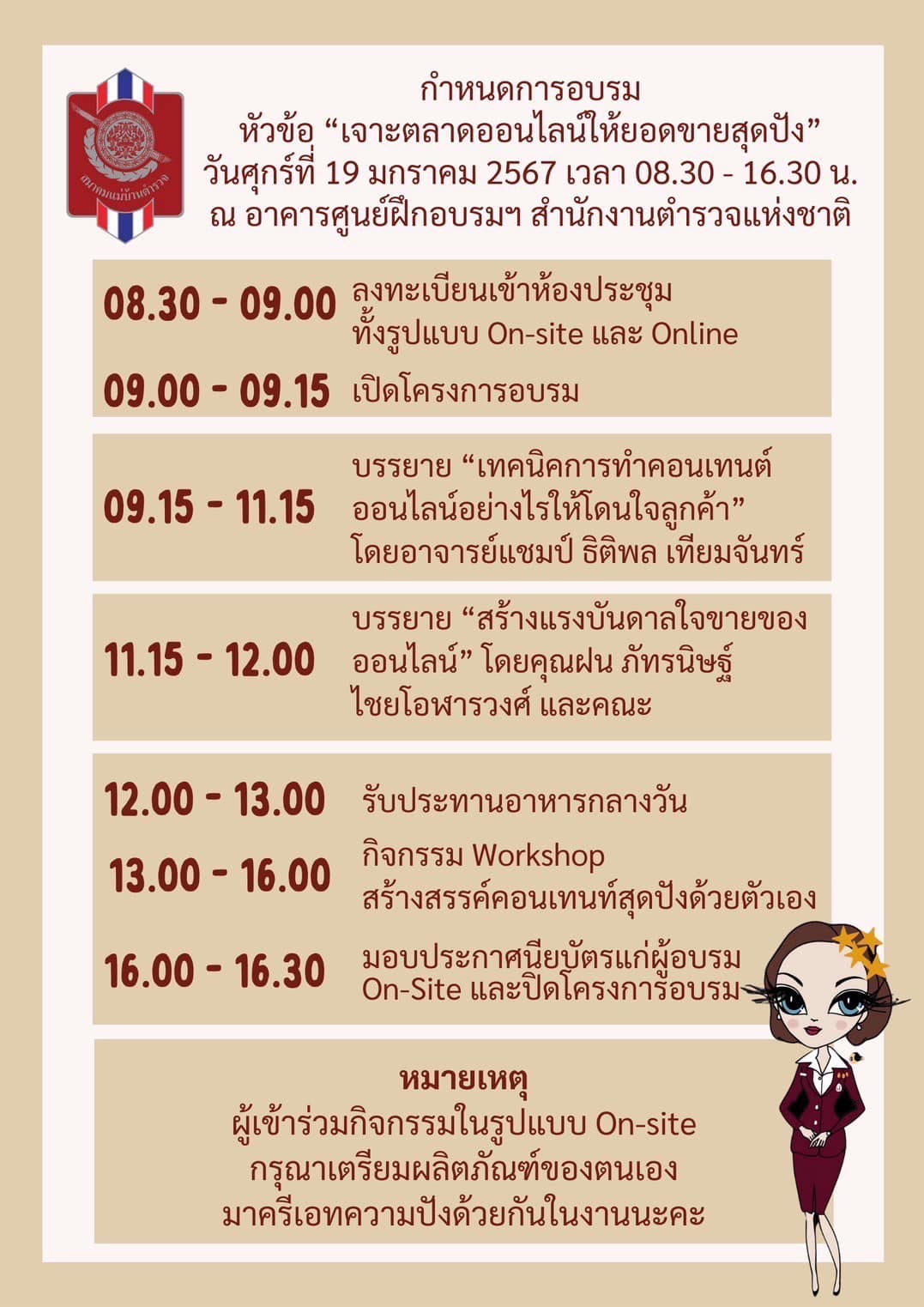 สมาคมแม่บ้านตำรวจ จัดอบรมการตลาดออนไลน์ ในหัวข้อเรื่อง “เจาะตลาดออนไลน์ให้ยอดขายสุดปัง” ในวันที่ 19 มกราคม 2567 ตั้งแต่ เวลา 08.30 – 16.30 น. ณ ชั้น 32 อาคารศูนยัฝึกอบรมฯ สำนักงานตำรวจแห่งชาติ โดยวิทยากรผู้เชี่ยวชาญชื่อดังเป็นที่ยอมรับจากโลกออนไลน์ มาบรรยายเกี่ยวกับ การสร้างแรงบันดาลใจในการขายของออนไลน์ เทคนิคดีๆในการทำคอนเทนต์อย่างไรให้โดนใจลูกค้า ท่านแรกคือ อาจารย์แชมป์ คุณธิติพล เทียมจันทร์ ที่ปรึกษาการตลาดออนไลน์ เจ้าของเว็บบล็อกเกี่ยวกับการตลาดและการตลาดออนไลน์ และเป็นผู้ก่อตั้งและร่วมบริหาร เว็บไซต์, อีคอมเมิร์ซแพลตฟอร์ม และ เว็บแอพพลิเคชั่น และอีกท่าน คือ คุณฝน คุณภัทรนิษฐ์ ไชยโอฬารวงศ์ เจ้าของ และ CEO Topslim ผู้ประสบความสำเร็จจากการตลาดออนไลน์ จะมาเล่าถึงประสบการณ์และไขข้อข้องใจต่างๆเกี่ยวกับการตลาดออนไลน์