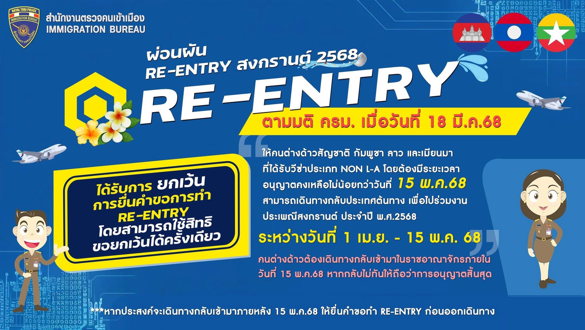 ทั้งนี้ คนต่างด้าวสามารถยื่นคำขอทำ Re-Entry ก่อนเดินทางออกเพื่อสงวนสิทธิ์วีซ่าได้ตามปกติ หากประสงค์จะเดินทางกลับเข้ามาภายหลังวันที่ 15 พ.ค.68