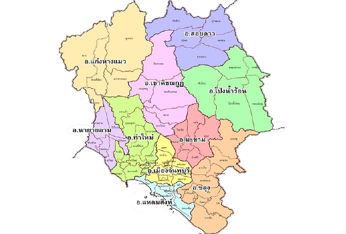 | 1.อำเภอเมืองจันทบุรี | 2.อำเภอขลุง | 3.อำเภอท่าใหม่ | 4.อำเภอโป่งน้ำร้อน | 5.อำเภอมะขาม |