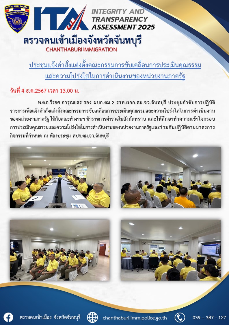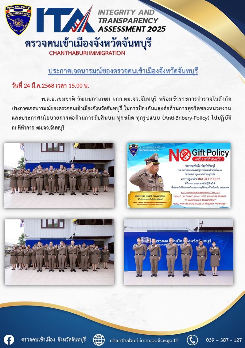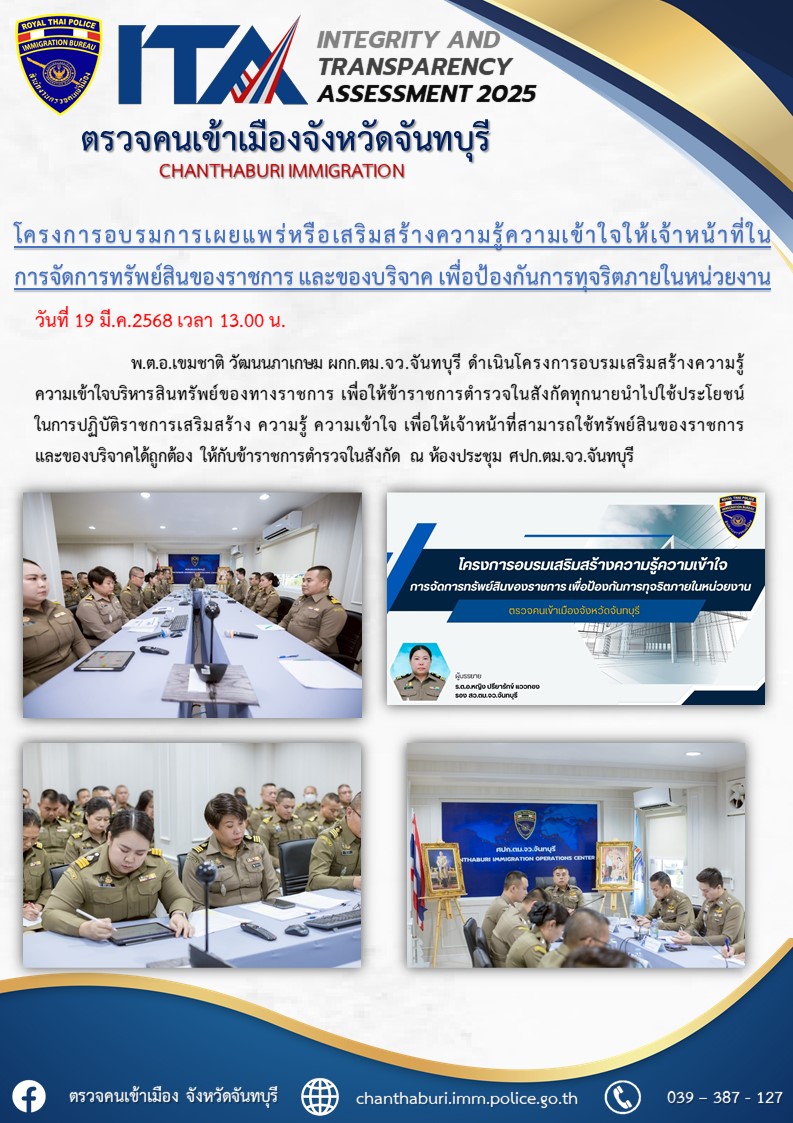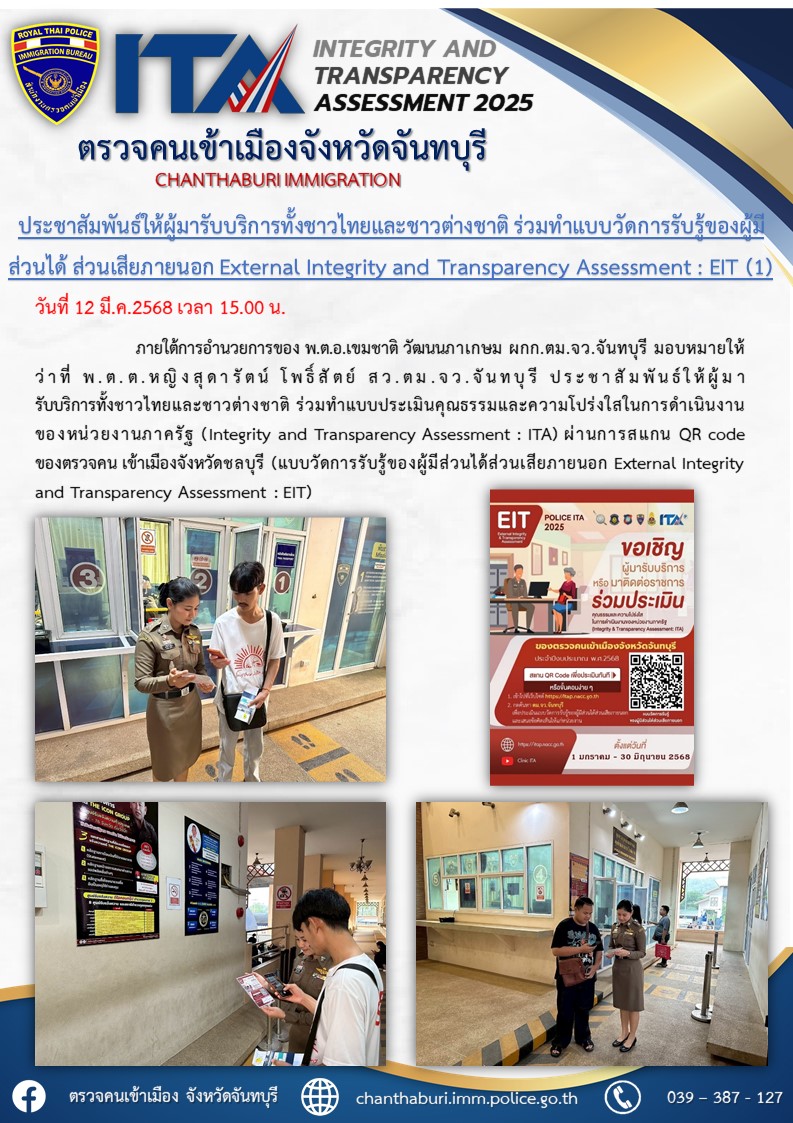 การประชาสัมพันธ์ข้อมูลผลการดำเนินงานการประเมินคุณธรรมและความโปร่งใส ในการดำเนินงานของหน่วยงานภาครัฐ (Integrity & Transparency Assessment ITA) ของตรวจคนเข้าเมืองจังหวัดจันทบุรี ประจำปีงบประมาณ พ.ศ. 2568