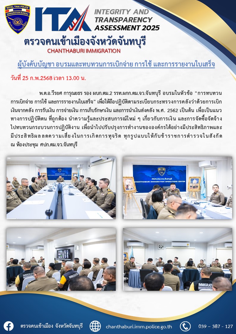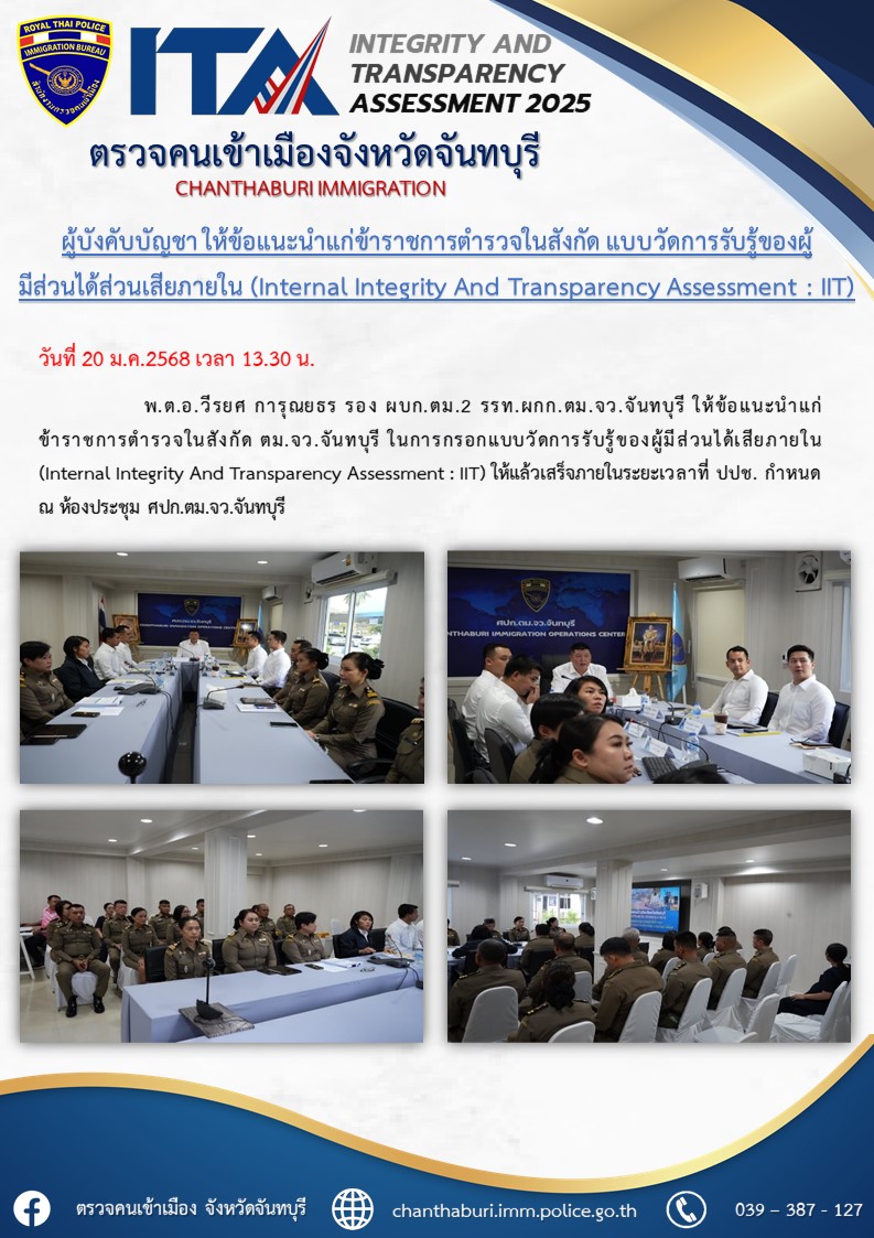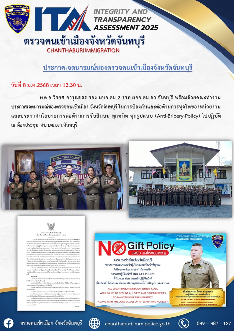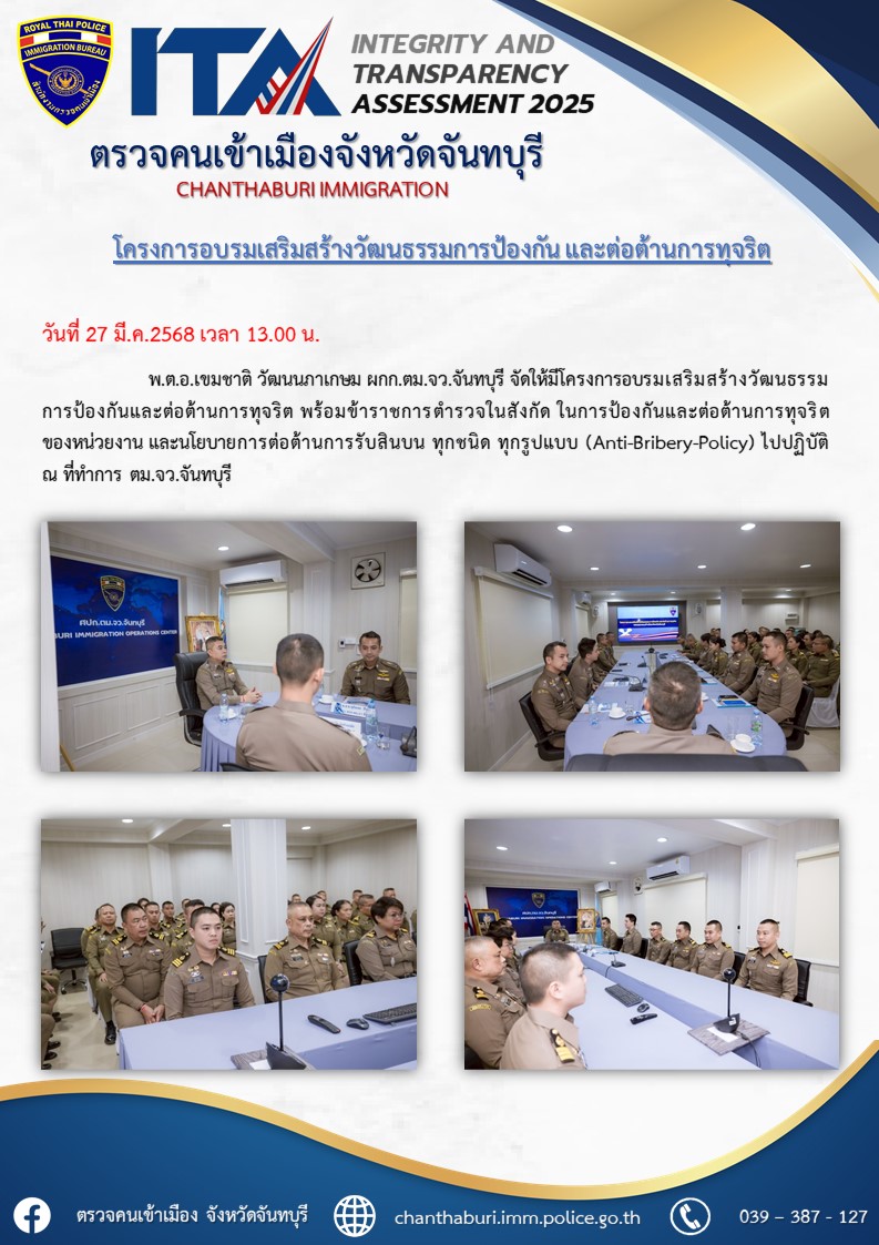 การประชาสัมพันธ์ข้อมูลผลการดำเนินงานการประเมินคุณธรรมและความโปร่งใส ในการดำเนินงานของหน่วยงานภาครัฐ (Integrity & Transparency Assessment ITA) ของตรวจคนเข้าเมืองจังหวัดจันทบุรี ประจำปีงบประมาณ พ.ศ. 2568
